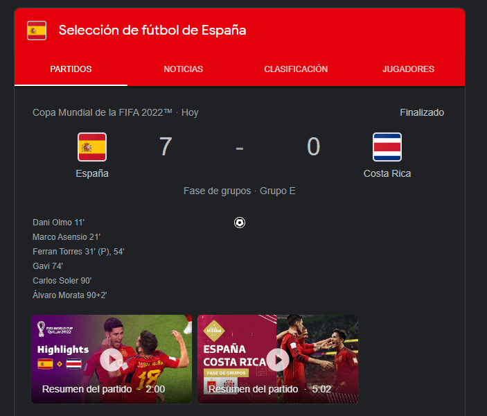 ESPAÑA CONTRA COSTA RICA: RESULTADO FINAL